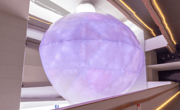 オランダパビリオンの象徴「次世代への太陽」。直径約10.6メートルもの大きさ。しかもそれが建物の真ん中に浮いている、さらには人が中に入場できるのだ。圧倒的な迫力と神秘性に誰もが驚き、魅了されるだろう。