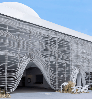 オランダパビリオンのもうひとつの象徴が波型ファサードだ。部材は板状にしたFRP(繊維強化プラスチック)。波型ファサードがとりつけられている三面の長さ約59メートル、高さ約8メートルの巨大な壁面をさまざまなカタチで流れる波は圧巻だ。ただ、約59メートルもあるので1本の長い部材でできているのではない。約130センチから160センチの短い波の部材をつないで構築されているのだ。